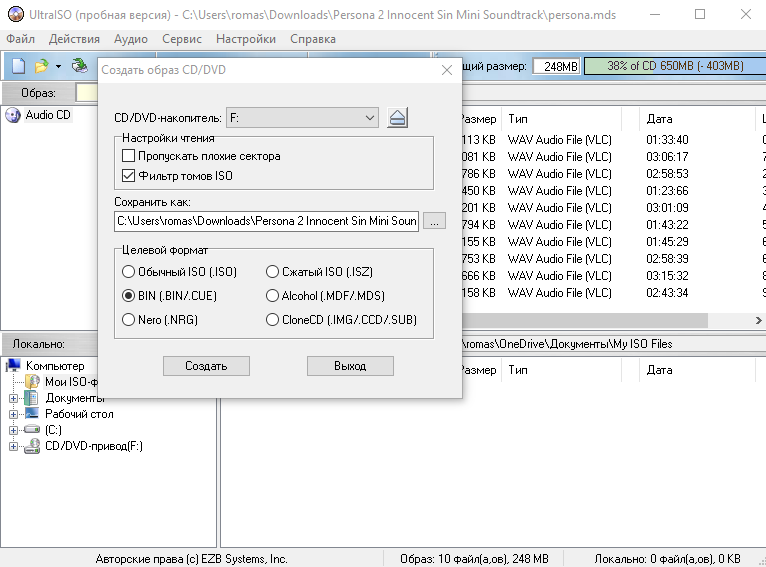 В общем вот так выглядит стандартная настройка программы? Не забудьте в поле "Сохранить как" указать нужное местоположение файла. Но почему для CD дисков используется BIN+CUE? Ну, отчасти потому что это самый распространённый формат, а также из-за того что музыку в таком формате слушать намного легче и удобнее. Раз уж гайд для всех дисков, то расскажу немного и про остальное.